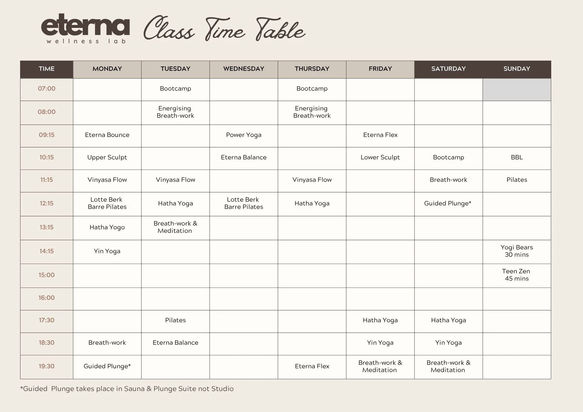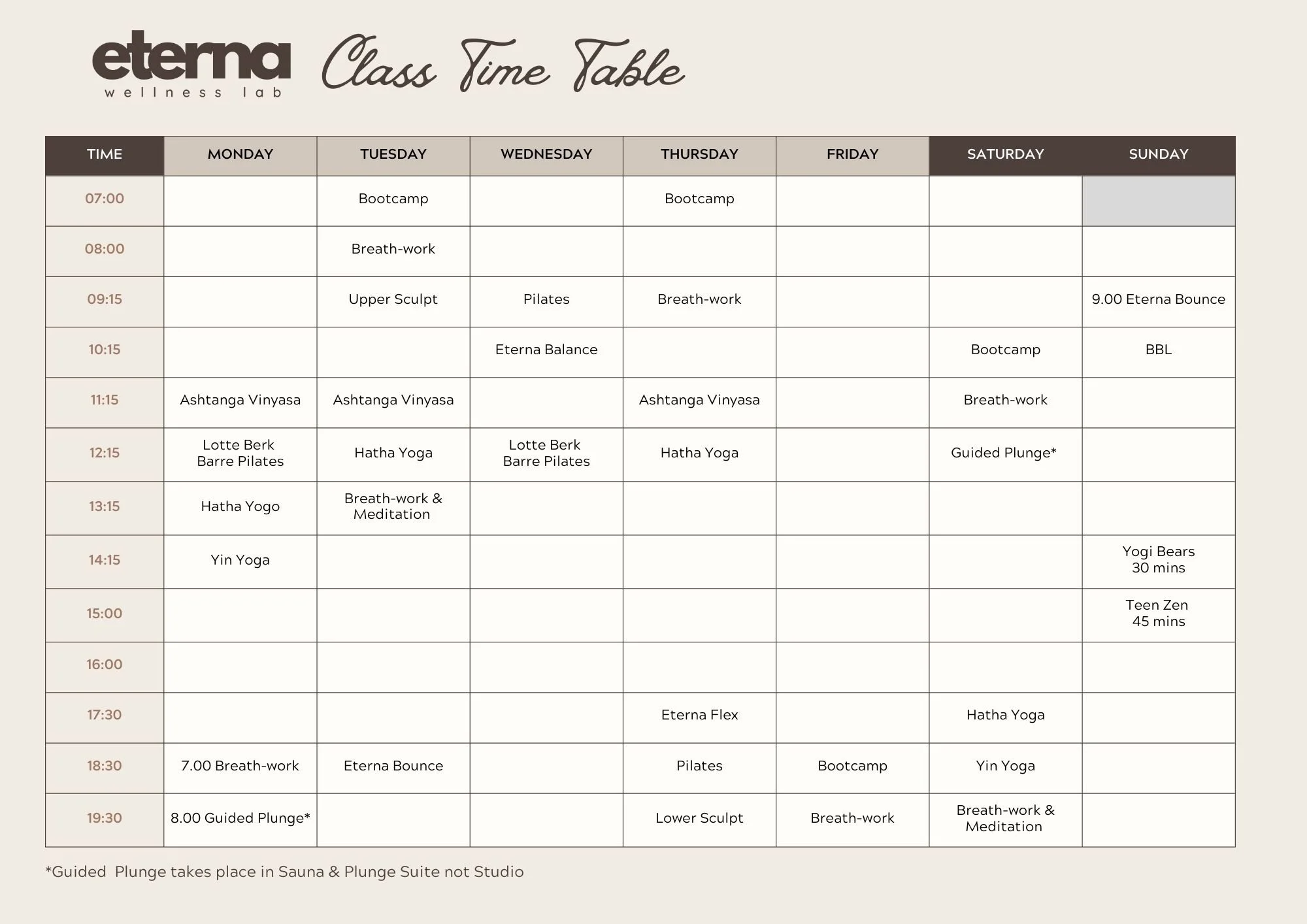 Step into the heart of movement and mindfulness at Eterna. Our tranquil studio is a space designed for strength, restoration, and deep connection—offering a carefully curated selection of classes that complement and enhance your wellness journey. See below…